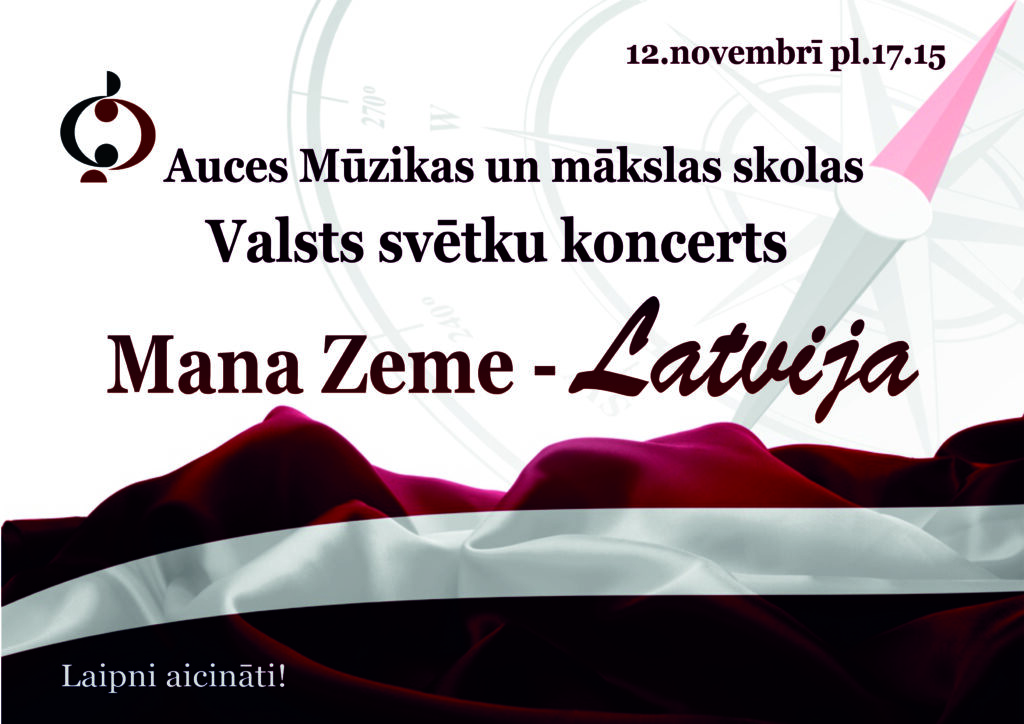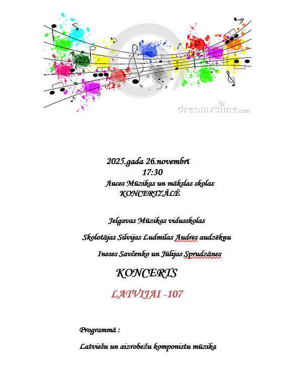 2025.gada 26.novembrī pl. 17:30 Auces Mūzikas un mākslas skolas koncertzālē Jelgavas Mūzikas vidusskolas skolotājas Silvijas Ludmilas Audres audzēkņu Ineses Savčenko un Jūlijas Sprudzānes koncerts” LATVIJAI -107″.  Programmā: Latviešu un aizrobežu komponistu mūzika.
